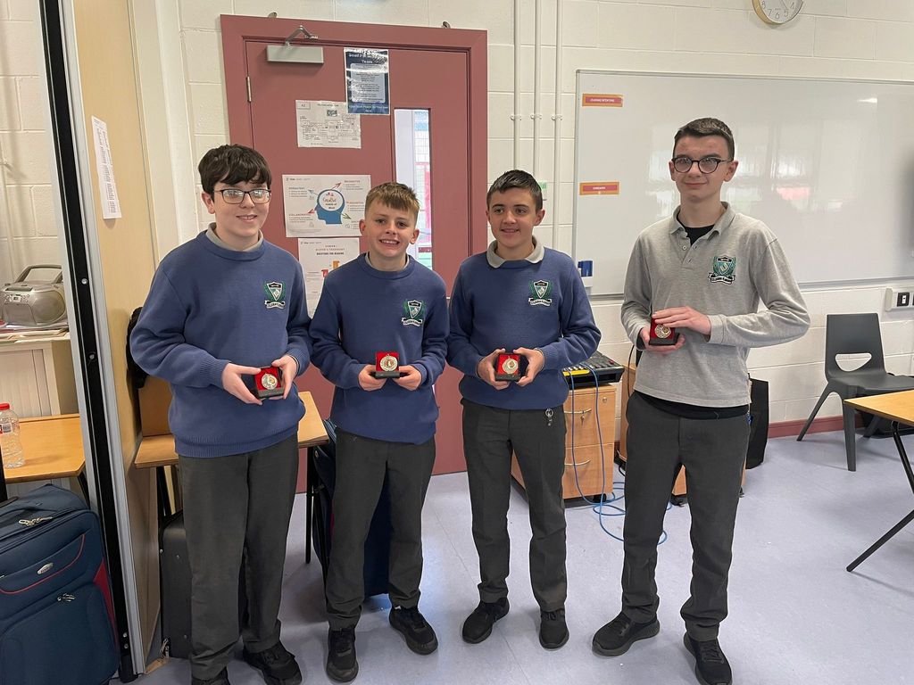 Our chess club runs every Wednesday at lunchtime under the guidance of Ms. O’Gorman and Mr. D Kelly. Last week our students took part in a chess tournament in Kilfinane in Limerick with 5 schools from Clare, Limerick and Tipp competing. There were 23 teams with 93 individuals involved. We took 12 first year students (3 teams of 4) with us, with one team finishing third overall, and Elvis finishing third in the individual standings. Both are through to the Irish Chess finals. Congratulations to Luke, Fionán, Max & Niall who finished in 3rd place. Well done to
