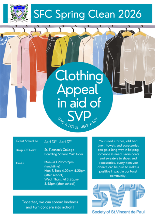 Our Junior SVP Conference are running their annual “Spring Clean” clothing appeal in aid of our local St. Vincent de Paul from Monday April 13th to Friday April 17th. The appeal is open to the whole school community and members of the public. It is a great way to clear out used/unwanted clothing from home while also helping our local community. Items can be dropped to the main door of the old college boarding school building at the following times,